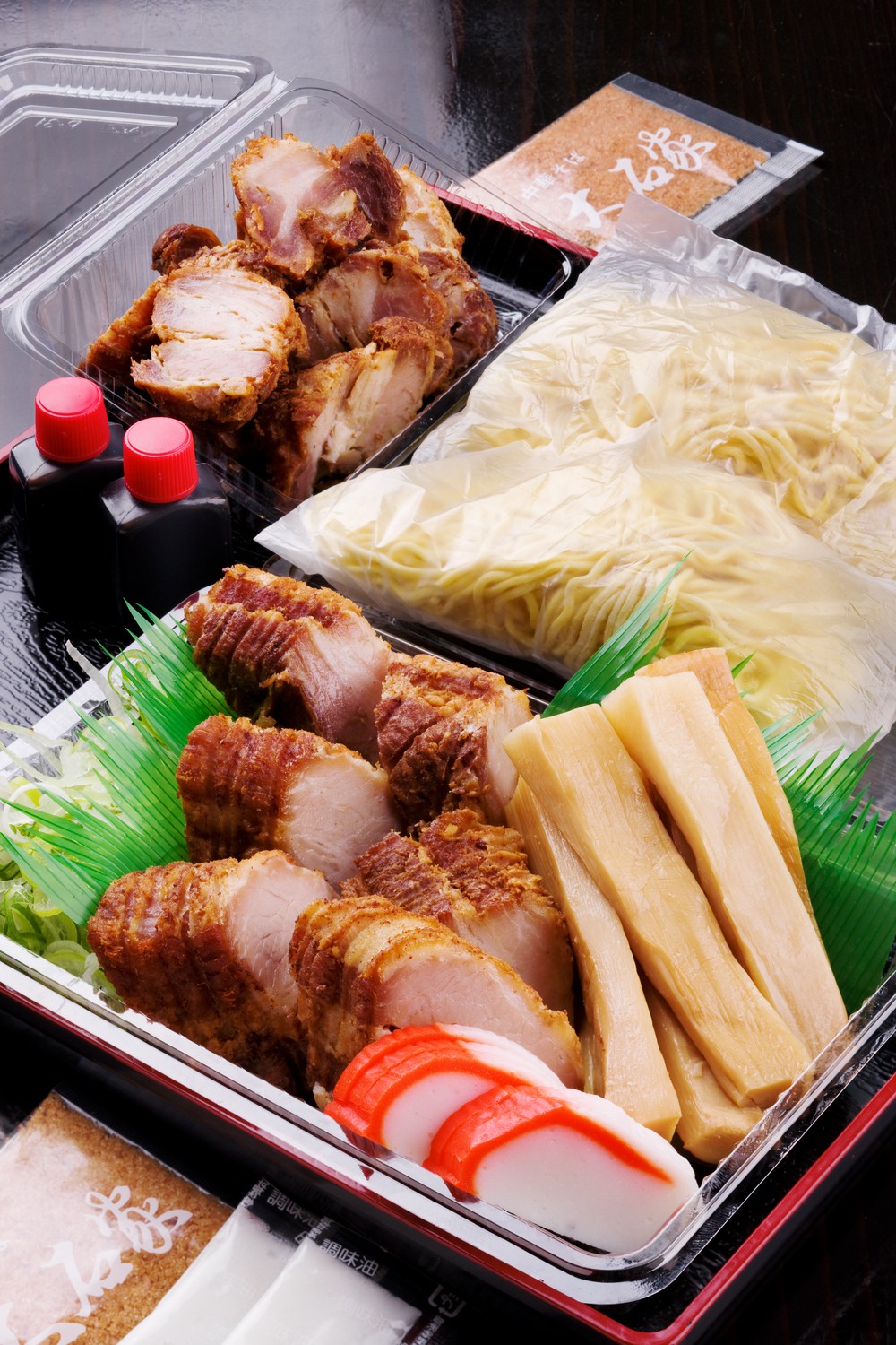 お持ち帰りは、生麺・チャーシュー・メンマ・ネギ・かまぼこがセットになっています。代引きで全国へ発送可能。