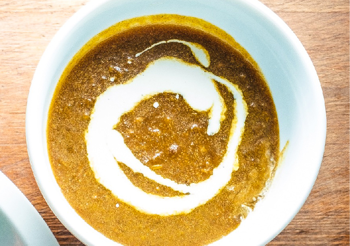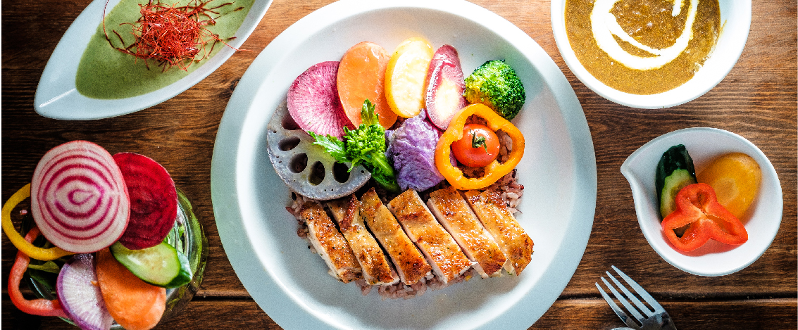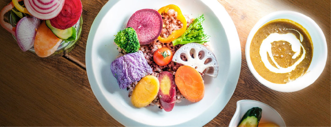 2種類のルーがつくのがここのカレーの特徴。一つは昆布だしや塩麹がきいた和風カレーで、玉ねぎの甘みとスパイスが溶け込んで優しい味わい。もう一つは、タイから取り寄せたペーストにココナッツミルクや塩麹、昆布白醤油を加えたタイと日本の食材を融合させたグリーンカレー。両カレーともに、動物性食品を一切使っていないが、コクはたっぷり。