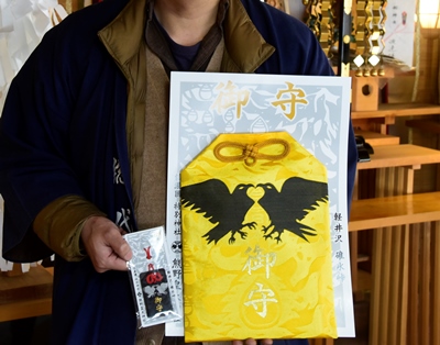 通常のお守りの約28倍の特大お守り。初穂料5000円。 長野県・群馬県の県境に位置する熊野皇大神