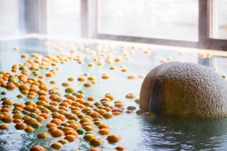 星野温泉トンボの湯は1月28日から31日まで、内湯に橙(だいだい)を浮かべた季節湯を開催する。橙湯
