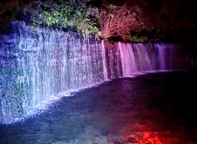 白糸ハイランドウェイは12月21日から、白糸の滝で「真冬のライトアップ」を行う。「星」「雪」「水」