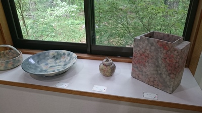 ギャラリー青では「花の器と衣展」を開催している。 佐渡の陶芸家・早川友加吏さんの作品、桜と椿を染め