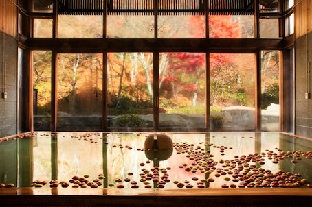 星野温泉トンボの湯は10月と11月に4日間ずつ、内湯にりんごを浮かべた「りんご湯」を開催する。旬に