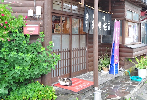 梅雨真っただ中。軽井沢は雨の日が続いています。駅前のそば屋「本陣」前で、寛いでいるネコを発見。雨宿り