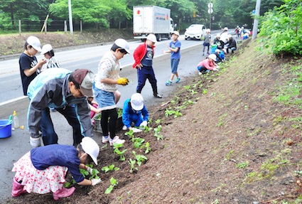 軽井沢東部小(児童数172人)の児童と教諭、地域住民が6月29日、離山通りなど学校の周りにヒマワリ