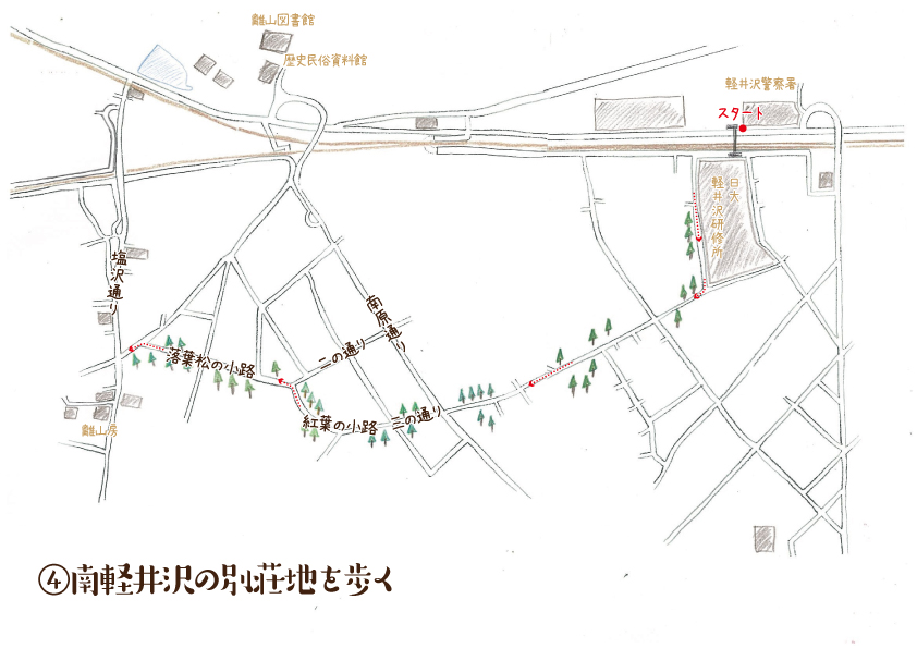 南軽井沢には歴史ある別荘地が広がっています。まず、軽井沢警察署前の歩道橋から南ヶ丘へ入りましょう。