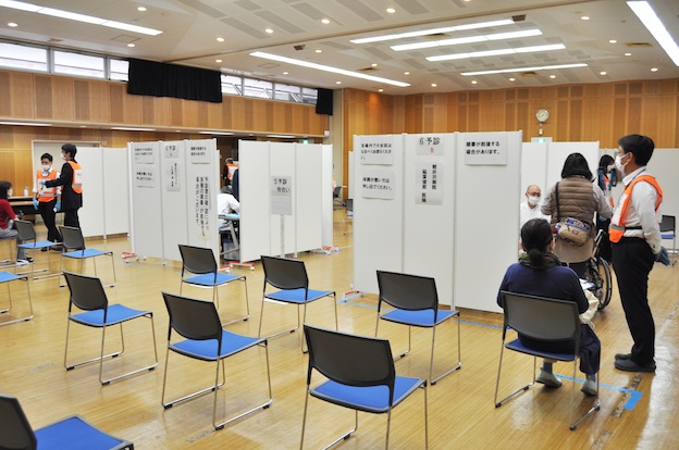 (写真)軽井沢プリンスホテルの職域接種の会場で、問診、接種を待つ観光従事者。 町内117の宿泊業
