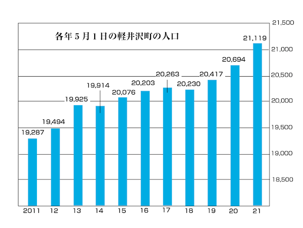 軽井沢町の人口がこの4月中に、初めて21,000人を超えた。4月1日の20,963人から、一カ月で