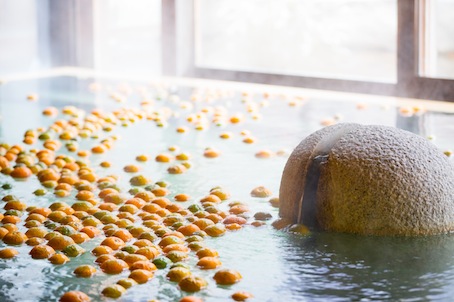 星野温泉トンボの湯は1月1日から3日、「ご縁が代々続くように」と縁起物の橙(だいだい)を内湯に浮か
