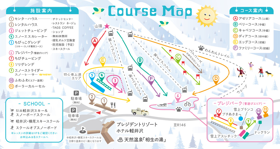 | アクセス | ・上信越自動車道 碓氷軽井沢I.C.から30km約40分。 ・JR北陸新幹線 軽井沢駅より22km約40分、軽井沢駅南口ロータリーより無料シャトルバス運行 ※ 前日17:00迄に、ご予約ください。 ・ご宿泊の場合(プレジデントリゾートホテル) TEL. 0279-84-1441 ・日帰りの場合 TEL. 0279-84-1227 |