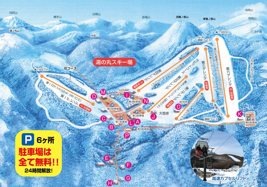 標高差255m、距離1,100mのワイドなゲレンデをはじめ、最大斜度28度の上級者コース、ポール専用コース、団体レッスン用の広場など、それぞれのレベルに合わせてスキー、スノボを楽しめる。ゲレンデ目の前の湯の丸高原ホテルでは露天風呂もあり、終日入浴可能で、冷えた体をあたためてくれる。疲労回復にもうれしい。