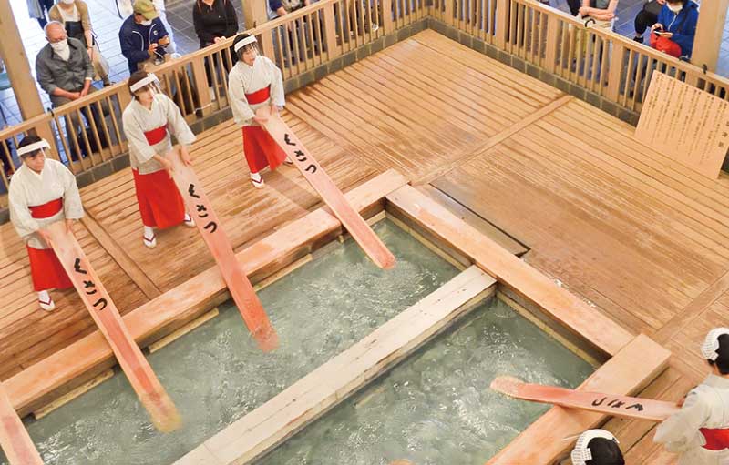 熱い湯を入浴できる温度まで下げる、江戸時代から続く草津名物「湯もみ」のショーは熱乃湯で開催。1日6回公演(大人600円・小学生300円)。週末は体験もあり。