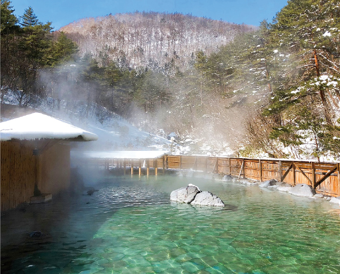 日本有数の大露天風呂。森林に囲まれた大きな湯船に浸かれば、日々の疲れも癒やされる。冬は雪見でゆったりと。