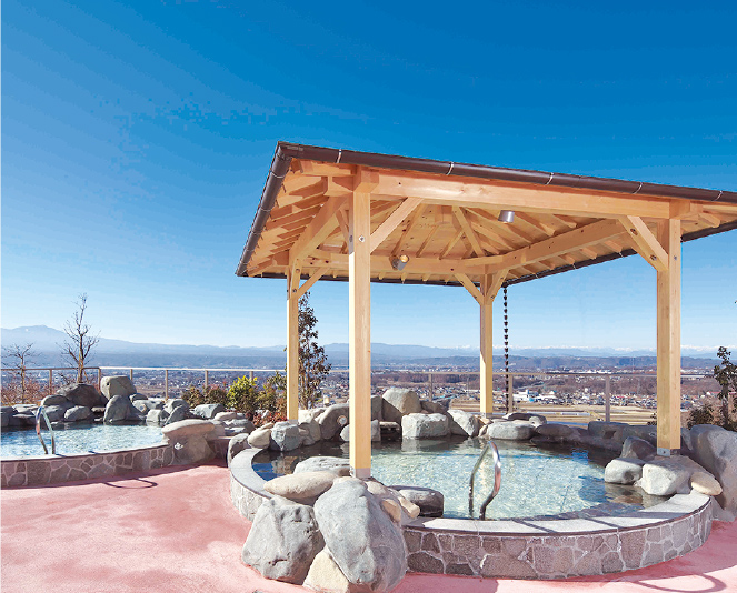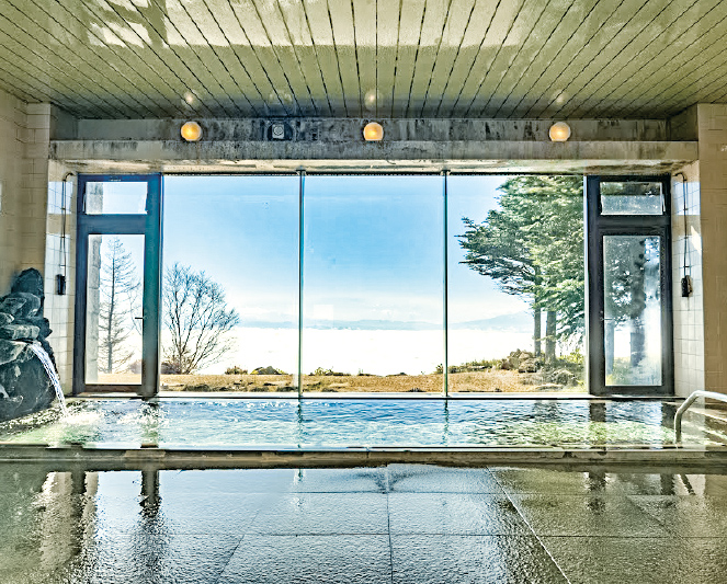 八ヶ岳連峰を望む絶景と天然温泉が自慢。食事処、岩盤浴、トレーニングルームなどを備える複合施設。