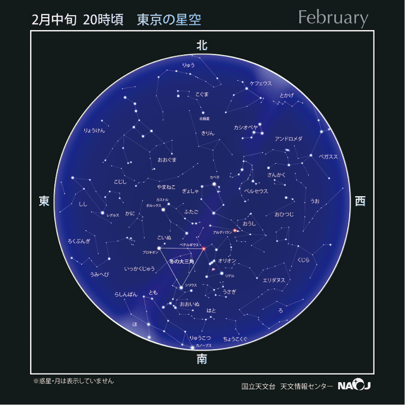 有名な星座や一等星が多い冬の星空。南の空を見上げると、まずは青白く輝く「おおいぬ座」のシリウスを見つけることができる。そこを頂点とした逆三角形右上に「オリオン座」のベテルギウス、左上に「こいぬ座」のプロキオンがあり、これを冬の大三角という。また、「オリオン座」の三つ星の下にあるオリオン大星雲は肉眼でも見え、双眼鏡を使えば大まかな形を確認することもできる。